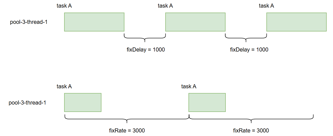 fixedDelay: 以上一次任务结束时间为计时开始,延迟xxx后执行下一次fixedRate: 不考虑任务执行什么时候结束,总是以固定的速率(Rate) 对任务进行调度